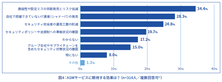 ASMサービスに期待する効果は、「脆弱性や設定ミスの早期発見とリスク低減」(34.4%)が最も多く、次いで「自社で把握できていないIT資産(シャドーIT)の発見」(28.3%)、「セキュリティ担当者の運用工数の削減」(24.8%)となり、サービス利用による実効性や管理効率の向上への期待が高いことが明らかとなりました。